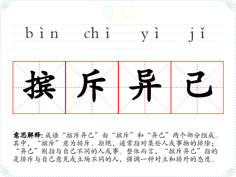 成语“摈斥异己”由“摈斥”和“异己”两个部分组成。其中,“摈斥”意为排斥、拒绝,通常指对某些人或事物的排除;“异己”则指与自己不同的人或事。整体而言,“摈斥异己”指的是排斥与自己意见或立场不同的人,强调一种对立和排外的态度。