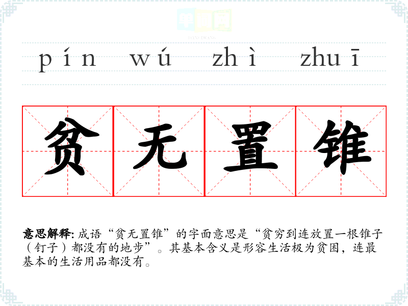成语“贫无置锥”的字面意思是“贫穷到连放置一根锥子(钉子)都没有的地步”。其基本含义是形容生活极为贫困,连最基本的生活用品都没有。