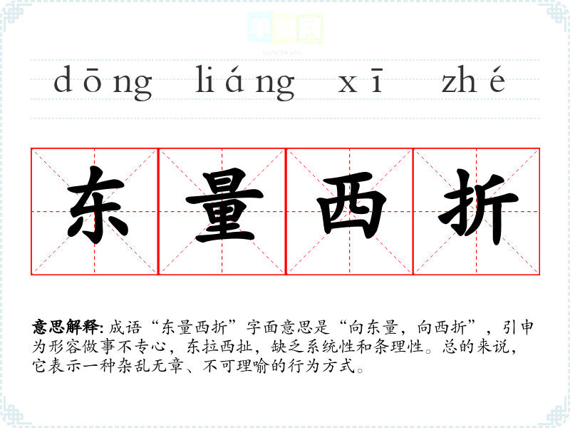 成语“东量西折”字面意思是“向东量,向西折”,引申为形容做事不专心,东拉西扯,缺乏系统性和条理性。总的来说,它表示一种杂乱无章、不可理喻的行为方式。