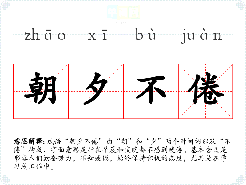 成语“朝夕不倦”由“朝”和“夕”两个时间词以及“不倦”构成,字面意思是指在早晨和夜晚都不感到疲倦。基本含义是形容人们勤奋努力,不知疲倦,始终保持积极的态度,尤其是在学*或工作中。