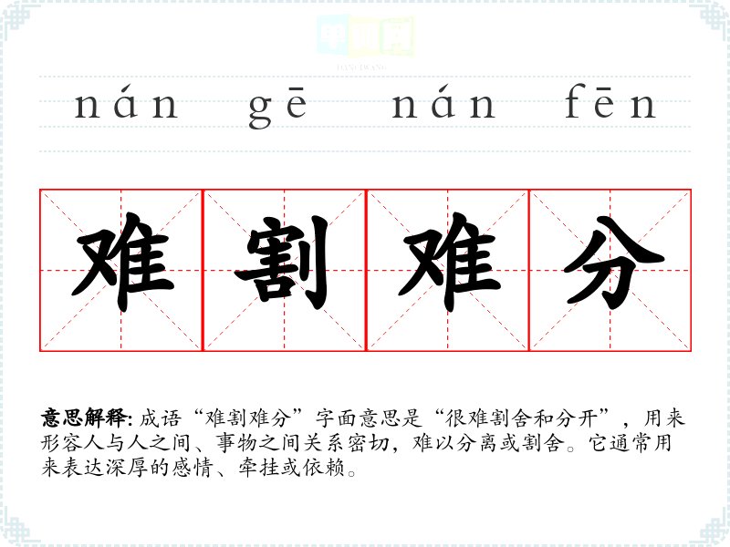 成语“难割难分”字面意思是“很难割舍和分开”,用来形容人与人之间、事物之间关系密切,难以分离或割舍。它通常用来表达深厚的感情、牵挂或依赖。