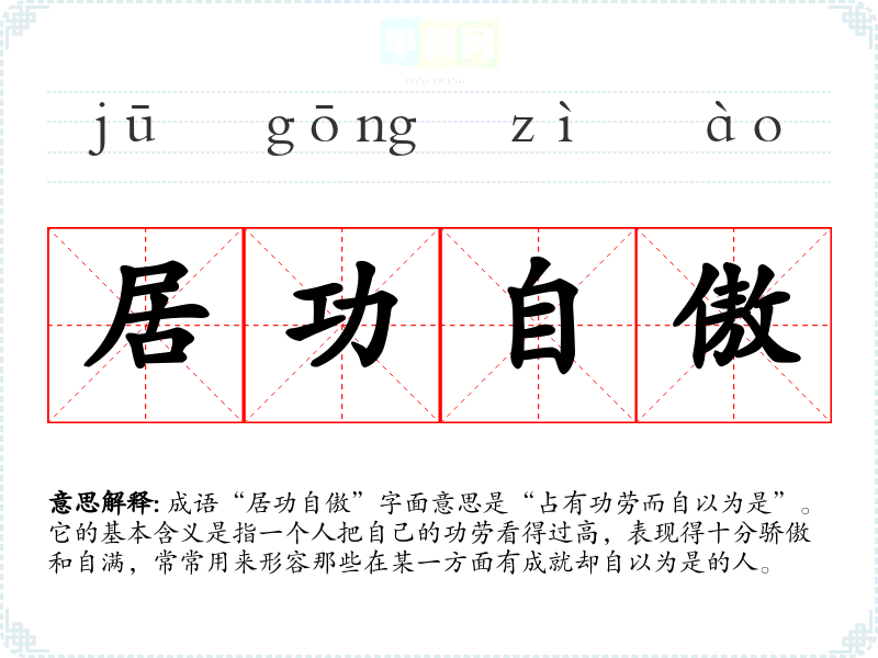 成语“居功自傲”字面意思是“占有功劳而自以为是”。它的基本含义是指一个人把自己的功劳看得过高,表现得十分骄傲和自满,常常用来形容那些在某一方面有成就却自以为是的人。