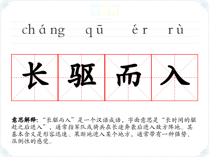 “长驱而入”是一个汉语成语,字面意思是“长时间的驱赶之后进入”,通常指军队或骑兵在长途奔袭后进入敌方阵地。其基本含义是形容迅速、果断地进入某个地方,通常带有一种强势、压倒性的感觉。