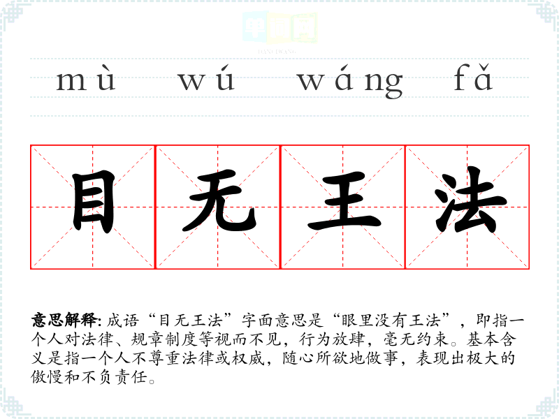 成语“目无王法”字面意思是“眼里没有王法”,即指一个人对法律、规章制度等视而不见,行为放肆,毫无约束。基本含义是指一个人不尊重法律或权威,随心所欲地做事,表现出极大的傲慢和不负责任。