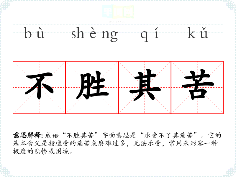 成语“不胜其苦”字面意思是“承受不了其痛苦”。它的基本含义是指遭受的痛苦或磨难过多,无法承受,常用来形容一种极度的悲惨或困境。