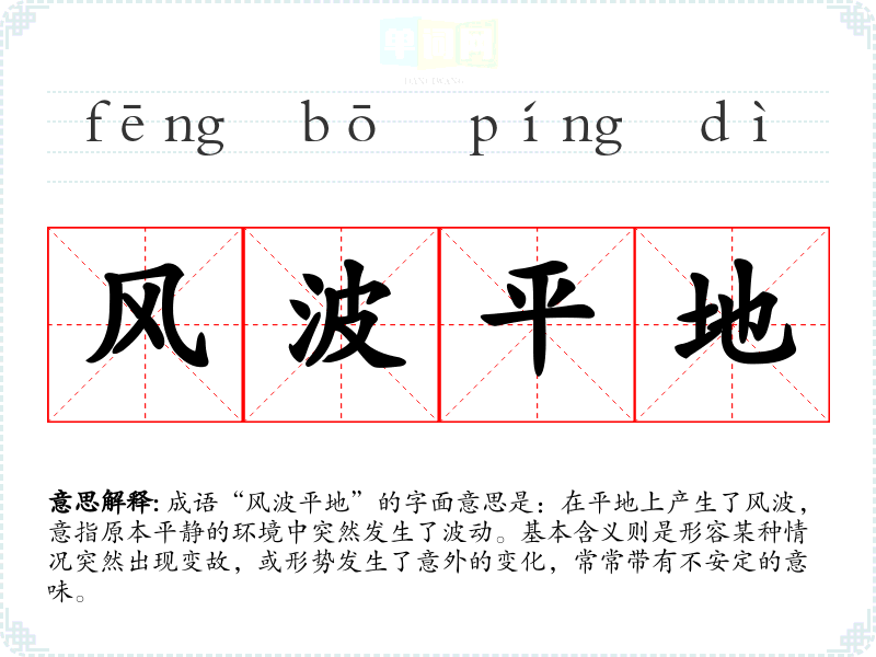 成语“风波平地”的字面意思是:在平地上产生了风波,意指原本平静的环境中突然发生了波动。基本含义则是形容某种情况突然出现变故,或形势发生了意外的变化,常常带有不安定的意味。