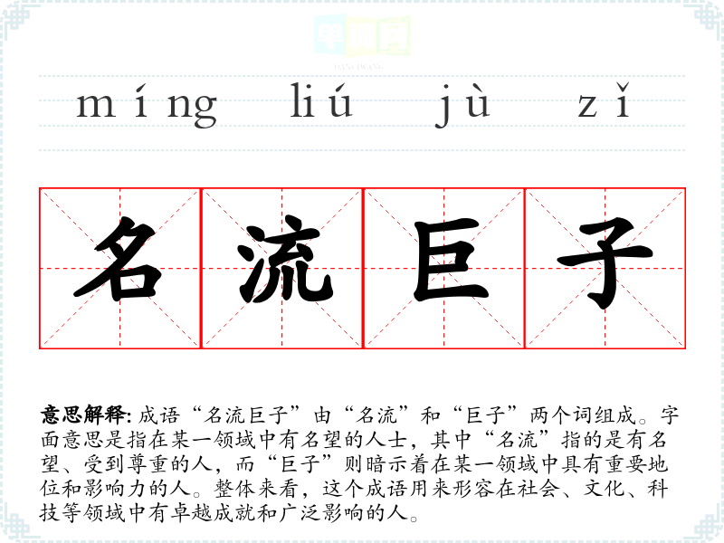“名流巨子”并没有特别明确的历史典故,但可以追溯到古代对杰出人物的称谓。在古代文人、士大夫中,常以“名流”形容那些有文化、有见识的人,而“巨子”则多用来指代政治、经济等领域的领袖人物。因此,这个成语反映了传统文化中对杰出人物的尊重和崇敬。
