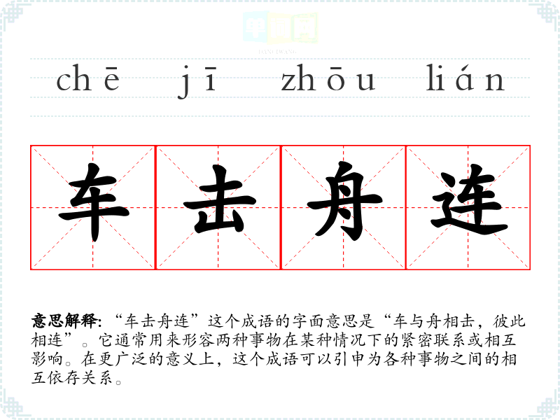 “车击舟连”这个成语的字面意思是“车与舟相击,彼此相连”。它通常用来形容两种事物在某种情况下的紧密联系或相互影响。在更广泛的意义上,这个成语可以引申为各种事物之间的相互依存关系。