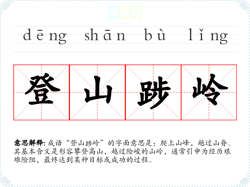 成语“登山踄岭”的字面意思是:爬上山峰,越过山脊。其基本含义是形容攀登高山,越过险峻的山岭,通常引申为经历艰难险阻,最终达到某种目标或成功的过程。