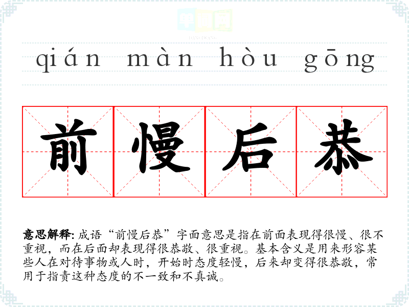 成语“前慢后恭”字面意思是指在前面表现得很慢、很不重视,而在后面却表现得很恭敬、很重视。基本含义是用来形容某些人在对待事物或人时,开始时态度轻慢,后来却变得很恭敬,常用于指责这种态度的不一致和不真诚。