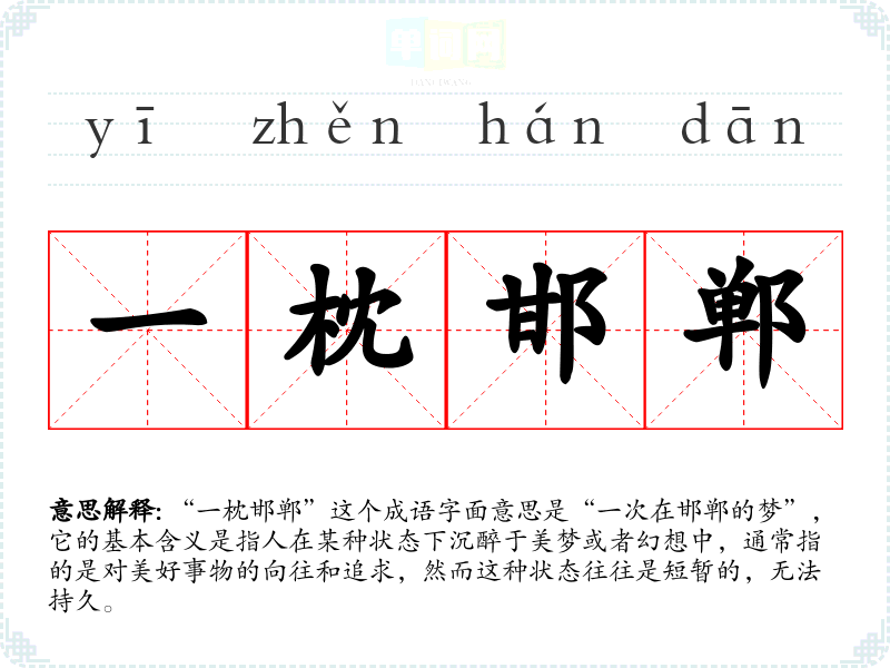 “一枕邯郸”这个成语字面意思是“一次在邯郸的梦”,它的基本含义是指人在某种状态下沉醉于美梦或者幻想中,通常指的是对美好事物的向往和追求,然而这种状态往往是短暂的,无法持久。