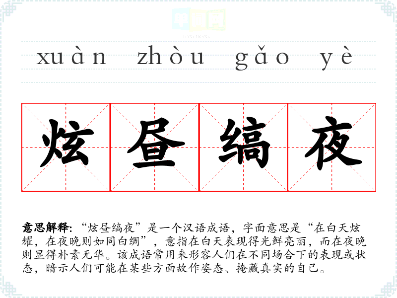 “炫昼缟夜”是一个汉语成语,字面意思是“在白天炫耀,在夜晚则如同白绸”,意指在白天表现得光鲜亮丽,而在夜晚则显得朴素无华。该成语常用来形容人们在不同场合下的表现或状态,暗示人们可能在某些方面故作姿态、掩藏真实的自己。