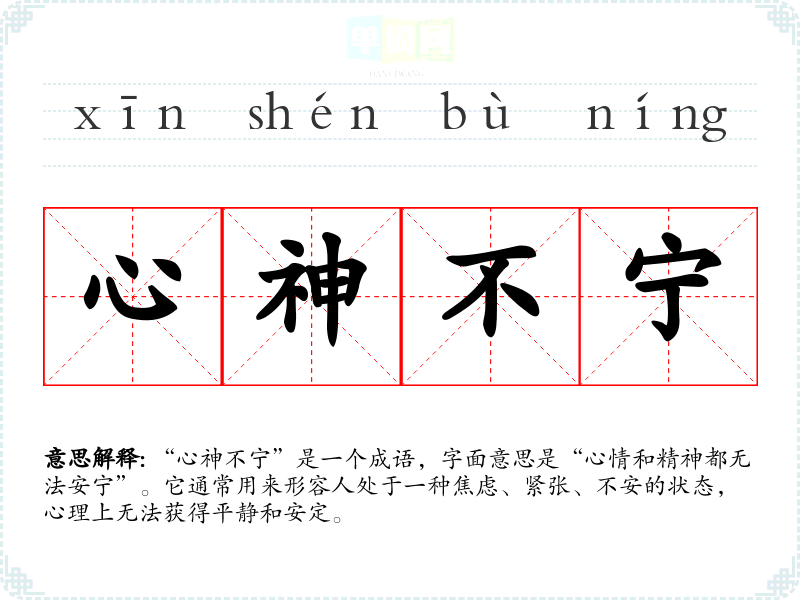 “心神不宁”是一个成语,字面意思是“心情和精神都无法安宁”。它通常用来形容人处于一种焦虑、紧张、不安的状态,心理上无法获得平静和安定。