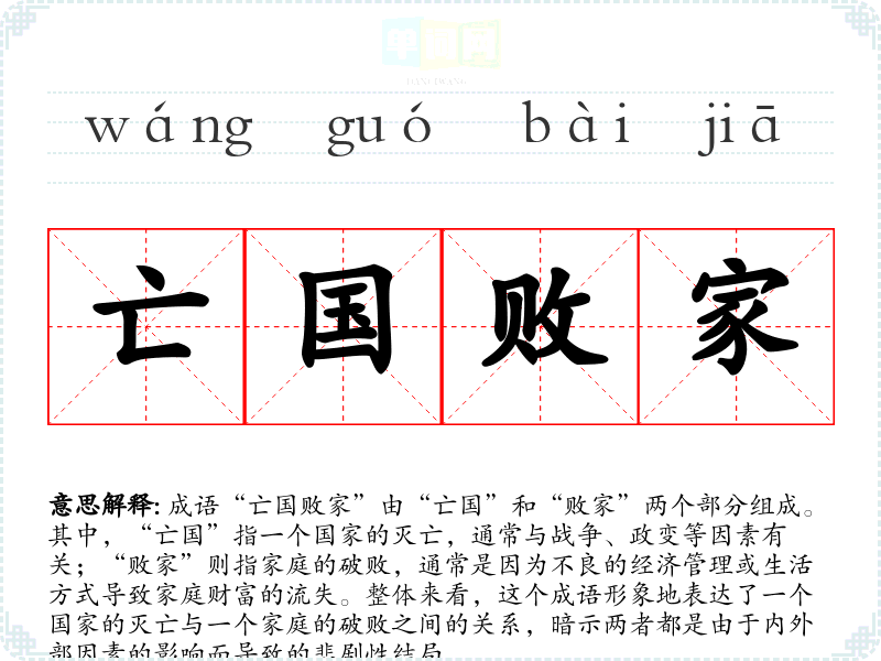 成语“亡国败家”由“亡国”和“败家”两个部分组成。其中,“亡国”指一个国家的灭亡,通常与战争、政变等因素有关;“败家”则指家庭的破败,通常是因为不良的经济管理或生活方式导致家庭财富的流失。整体来看,这个成语形象地表达了一个国家的灭亡与一个家庭的破败之间的关系,暗示两者都是由于内外部因素的影响而导致的悲剧性结局。