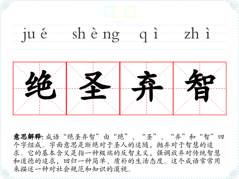 成语“绝圣弃智”由“绝”、“圣”、“弃”和“智”四个字组成。字面意思是断绝对于圣人的追随,抛弃对于智慧的追求。它的基本含义是指一种极端的反智主义,强调放弃对传统智慧和道德的追求,回归一种简单、质朴的生活态度。这个成语常常用来描述一种对社会规范和知识的漠视。