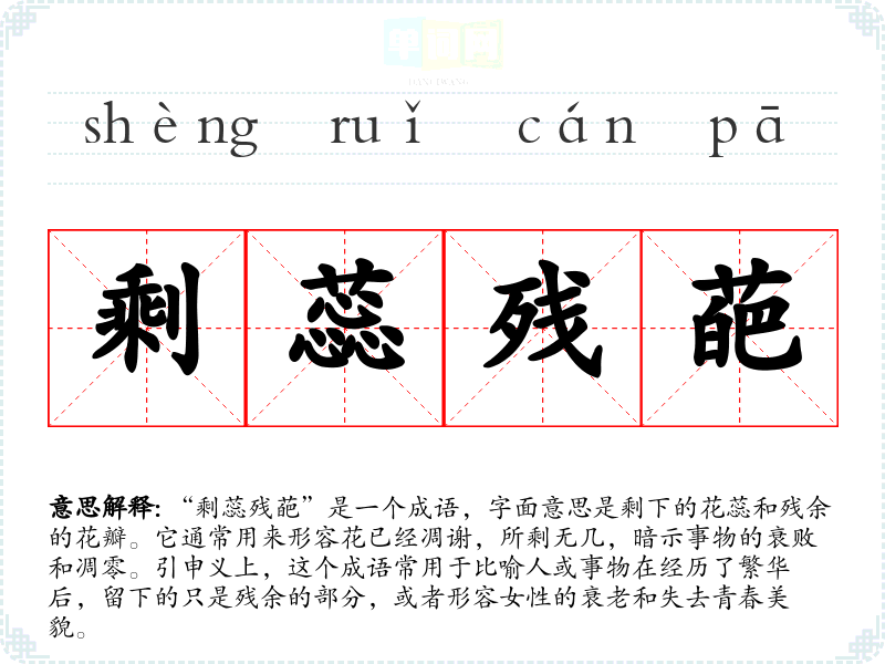 “剩蕊残葩”是一个成语,字面意思是剩下的花蕊和残余的花瓣。它通常用来形容花已经凋谢,所剩无几,暗示事物的衰败和凋零。引申义上,这个成语常用于比喻人或事物在经历了繁华后,留下的只是残余的部分,或者形容女性的衰老和失去青春美貌。