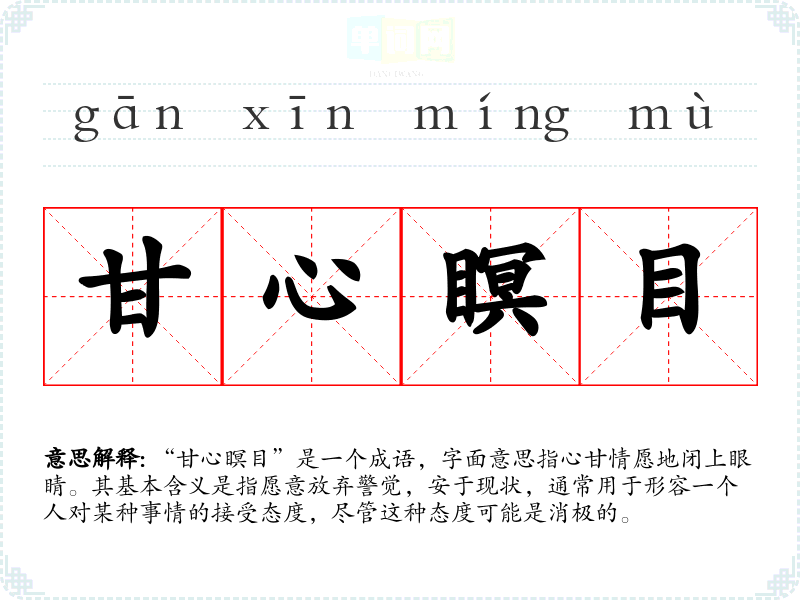 “甘心瞑目”是一个成语,字面意思指心甘情愿地闭上眼睛。其基本含义是指愿意放弃警觉,安于现状,通常用于形容一个人对某种事情的接受态度,尽管这种态度可能是消极的。