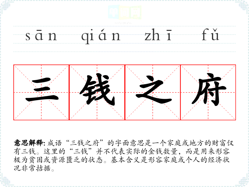 成语“三钱之府”的字面意思是一个家庭或地方的财富仅有三钱。这里的“三钱”并不代表实际的金钱数量,而是用来形容极为贫困或资源匮乏的状态。基本含义是形容家庭或个人的经济状况非常拮据。