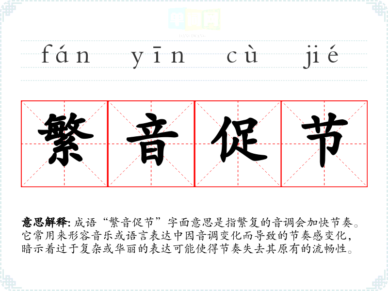 成语“繁音促节”字面意思是指繁复的音调会加快节奏。它常用来形容音乐或语言表达中因音调变化而导致的节奏感变化,暗示着过于复杂或华丽的表达可能使得节奏失去其原有的流畅性。