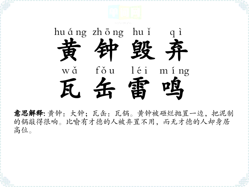 | 黄钟毁弃,瓦缶雷鸣 | 黄钟:大钟;瓦缶:瓦锅。黄钟被砸烂抛置一边,把泥制的锅敲得很响。比喻有才德的人被弃置不用,而无才德的人却身居高位。 |