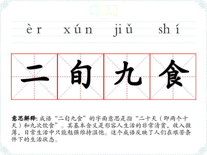 成语“二旬九食”的字面意思是指“二十天(即两个十天)和九次饮食”。其基本含义是形容人生活的非常清贫,收入微*,日常生活中只能勉强维持温饱。这个成语反映了人们在艰苦条件下的生活状态。