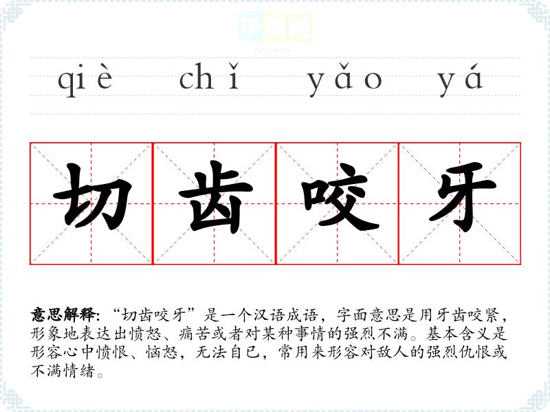 “切齿咬牙”是一个汉语成语,字面意思是用牙齿咬紧,形象地表达出愤怒、痛苦或者对某种事情的强烈不满。基本含义是形容心中愤恨、恼怒,无法自已,常用来形容对敌人的强烈仇恨或不满情绪。