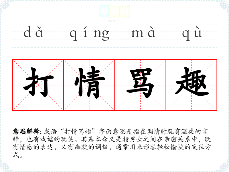 成语“打情骂趣”字面意思是指在调情时既有温柔的言辞,也有戏谑的玩笑。其基本含义是指男女之间在亲密关系中,既有情感的表达,又有幽默的调侃,通常用来形容轻松愉快的交往方式。