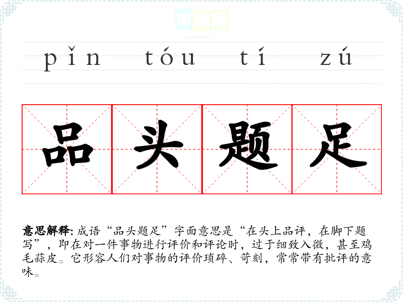 成语“品头题足”字面意思是“在头上品评,在脚下题写”,即在对一件事物进行评价和评论时,过于细致入微,甚至鸡毛蒜皮。它形容人们对事物的评价琐碎、苛刻,常常带有批评的意味。