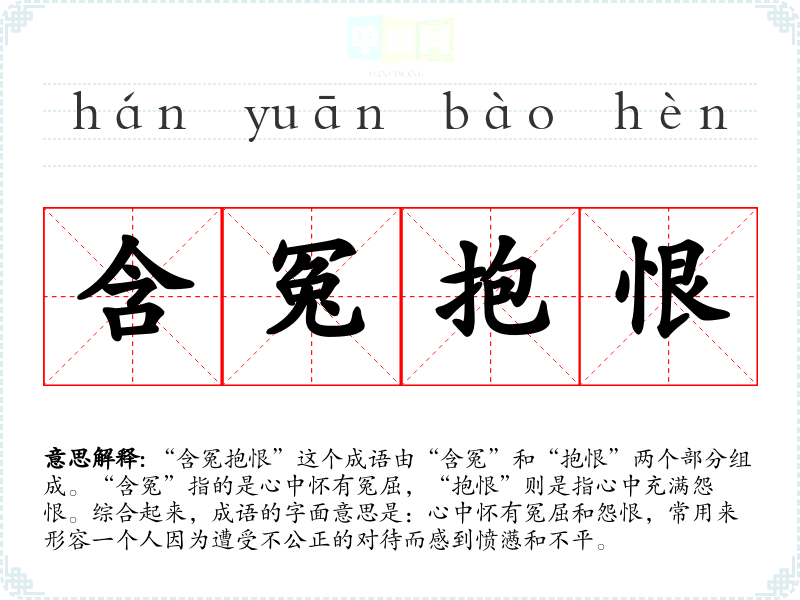 “含冤抱恨”这个成语由“含冤”和“抱恨”两个部分组成。“含冤”指的是心中怀有冤屈,“抱恨”则是指心中充满怨恨。综合起来,成语的字面意思是:心中怀有冤屈和怨恨,常用来形容一个人因为遭受不公正的对待而感到愤懑和不平。