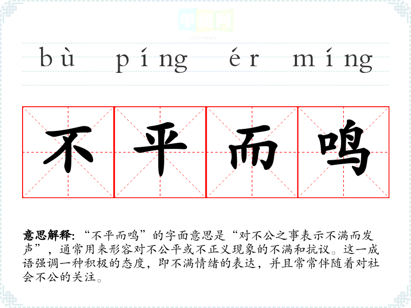 “不平而鸣”的字面意思是“对不公之事表示不满而发声”,通常用来形容对不公平或不正义现象的不满和抗议。这一成语强调一种积极的态度,即不满情绪的表达,并且常常伴随着对社会不公的关注。