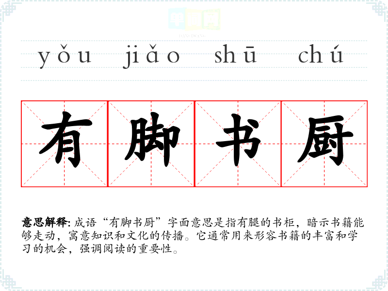 成语“有脚书厨”字面意思是指有腿的书柜,暗示书籍能够走动,寓意知识和文化的传播。它通常用来形容书籍的丰富和学*的机会,强调阅读的重要性。
