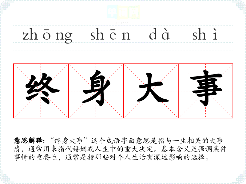 “终身大事”这个成语字面意思是指与一生相关的大事情,通常用来指代婚姻或人生中的重大决定。基本含义是强调某件事情的重要性,通常是指那些对个人生活有深远影响的选择。