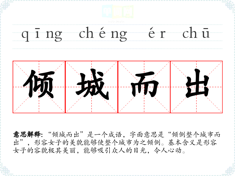 “倾城而出”源自古代文学,最早见于《红楼梦》中,书中描述了林黛玉的容貌,形容其美丽如花,能够倾倒众生。这个成语表达了对女性美丽的极致赞美,反映了古代社会对女性外貌的重视。