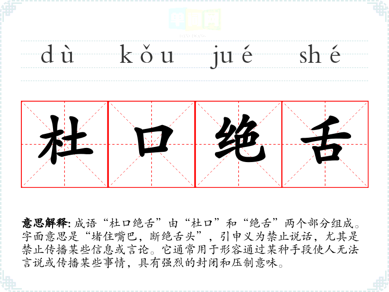 成语“杜口绝舌”由“杜口”和“绝舌”两个部分组成。字面意思是“堵住嘴巴,断绝舌头”,引申义为禁止说话,尤其是禁止传播某些信息或言论。它通常用于形容通过某种手段使人无法言说或传播某些事情,具有强烈的封闭和压制意味。