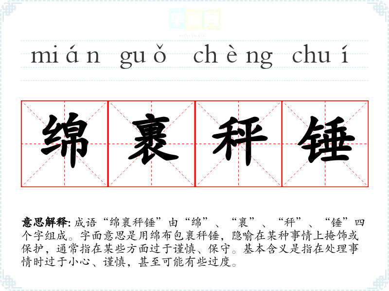 成语“绵裹秤锤”由“绵”、“裹”、“秤”、“锤”四个字组成。字面意思是用绵布包裹秤锤,隐喻在某种事情上掩饰或保护,通常指在某些方面过于谨慎、保守。基本含义是指在处理事情时过于小心、谨慎,甚至可能有些过度。