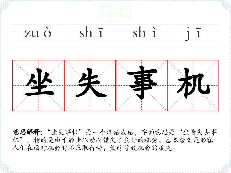 “坐失事机”是一个汉语成语,字面意思是“坐着失去事机”,指的是由于静坐不动而错失了良好的机会。基本含义是形容人们在面对机会时不采取行动,最终导致机会的流失。