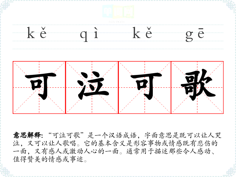 “可泣可歌”是一个汉语成语,字面意思是既可以让人哭泣,又可以让人歌唱。它的基本含义是形容事物或情感既有悲伤的一面,又有感人或激动人心的一面。通常用于描述那些令人感动、值得赞美的情感或事迹。