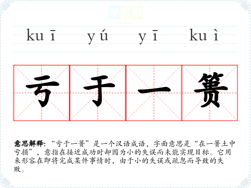 “亏于一篑”是一个汉语成语,字面意思是“在一篑土中亏损”,意指在接近成功时却因为小的失误而未能实现目标。它用来形容在即将完成某件事情时,由于小的失误或疏忽而导致的失败。