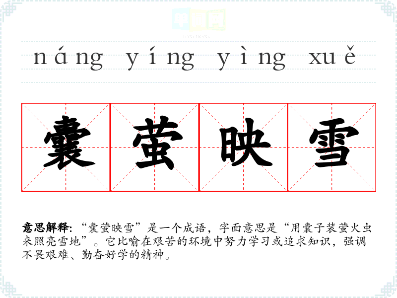 | 囊萤积雪 | 囊萤:晋代人车胤收集萤火虫读书;积雪:晋代人孙康映雪读书。形容刻苦攻读,勤学上进。 |