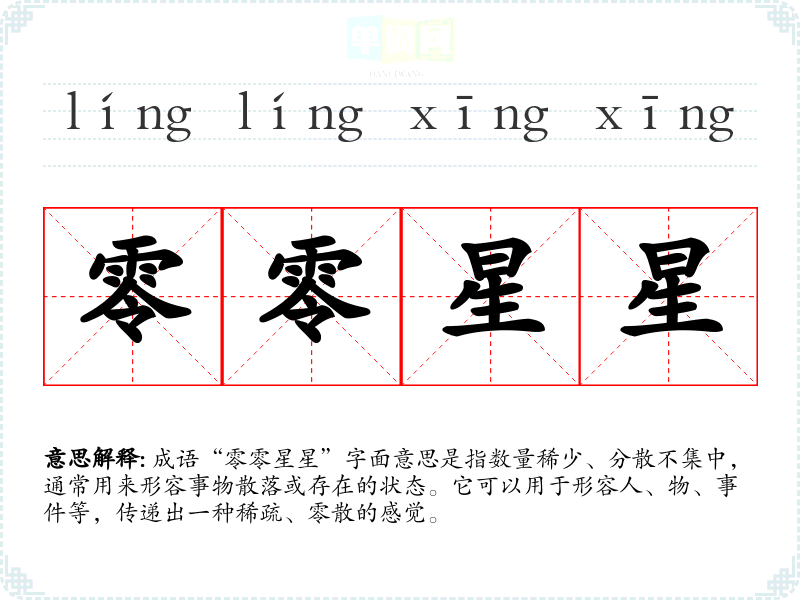 成语“零零星星”字面意思是指数量稀少、分散不集中,通常用来形容事物散落或存在的状态。它可以用于形容人、物、**等,传递出一种稀疏、零散的感觉。