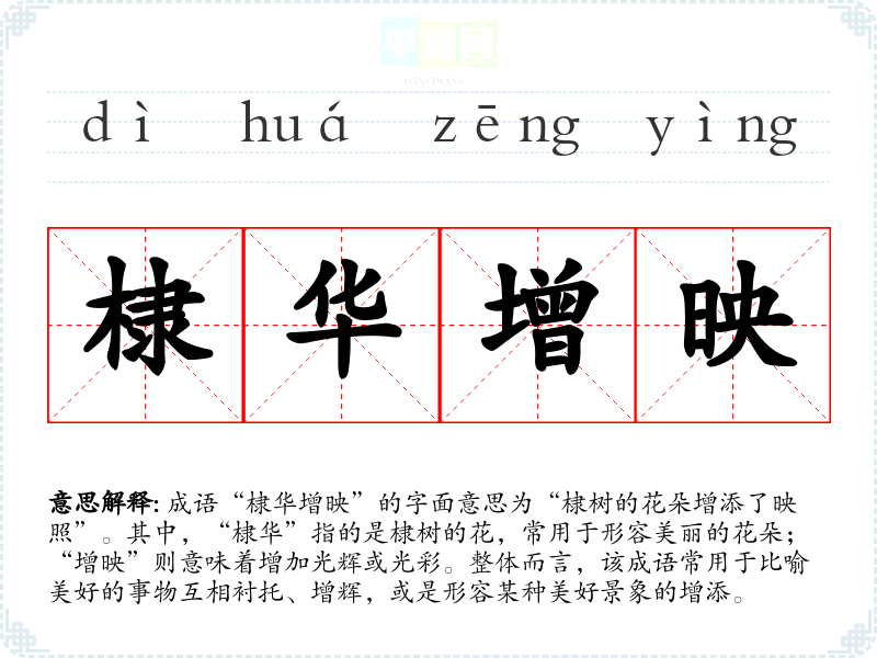 在**传统文化中,花朵常常象征美好和希望,因此“棣华增映”不仅表达了对自然美的赞美,也体现了人际关系中的和谐美好。在现代社会,这个成语仍然适用于强调团队合作和人际交往中的相互成就,具有普遍的适用性。