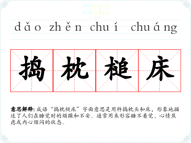 | 捣枕槌床 | 烦躁,无奈,气愤或悲痛的样子。形容辗转难以入睡。 |