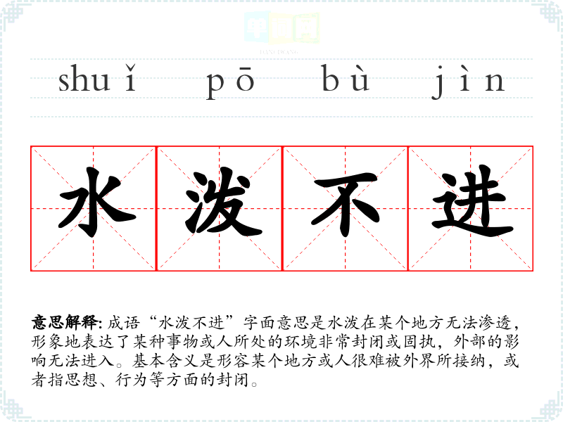 成语“水泼不进”字面意思是水泼在某个地方无法渗透,形象地表达了某种事物或人所处的环境非常封闭或固执,外部的影响无法进入。基本含义是形容某个地方或人很难被外界所接纳,或者指思想、行为等方面的封闭。