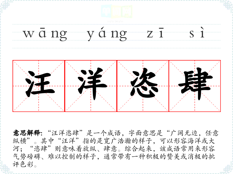 - 反义成语:循规蹈矩、恪守成规。这些成语反映的是一种拘束和守规的态度,与“汪洋恣肆”的放纵形成对比。