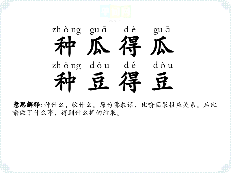 | 种瓜得瓜,种豆得豆 | 种什么,收什么。原为佛教语,比喻因果报应关系。后比喻做了什么事,得到什么样的结果。 |