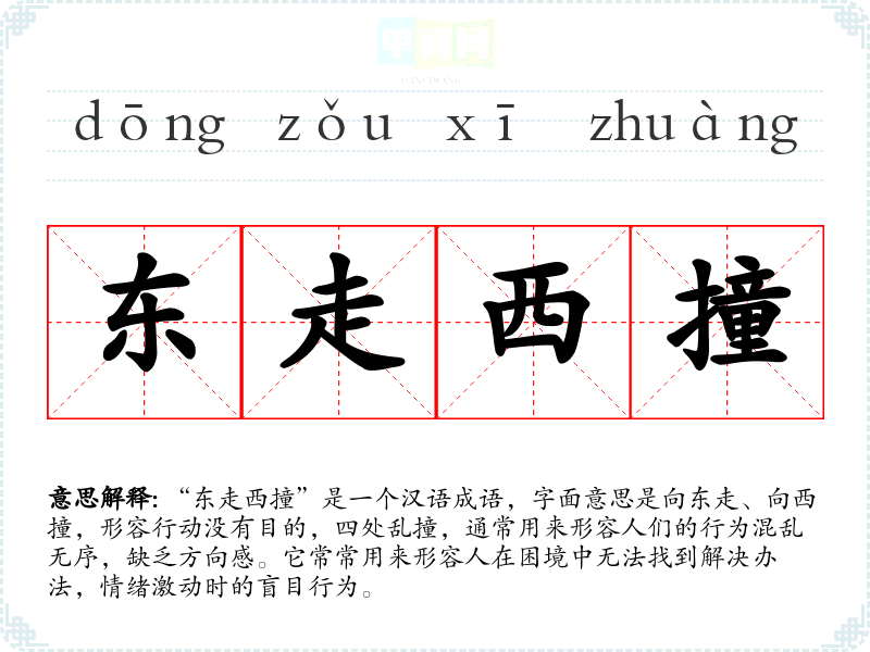 “东走西撞”并没有明确的历史典故来源,但其构造中包含了方向感的对比,强调了行动的随意和无序。在古代文学中,类似的表达方式常用于描写人们在困境中的茫然和无助。