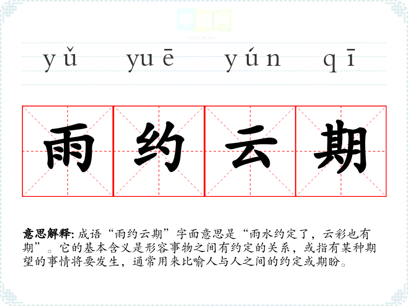 成语“雨约云期”字面意思是“雨水约定了,云彩也有期”。它的基本含义是形容事物之间有约定的关系,或指有某种期望的事情将要发生,通常用来比喻人与人之间的约定或期盼。