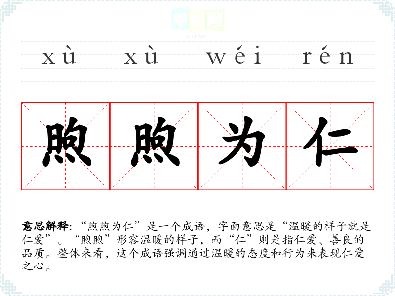 “煦煦为仁”是一个成语,字面意思是“温暖的样子就是仁爱”。“煦煦”形容温暖的样子,而“仁”则是指仁爱、善良的品质。整体来看,这个成语强调通过温暖的态度和行为来表现仁爱之心。