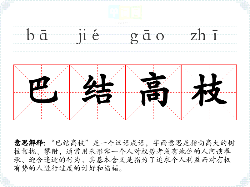 “巴结高枝”是一个汉语成语,字面意思是指向高大的树枝靠拢、攀附,通常用来形容一个人对权势者或有地位的人阿谀奉承、迎合逢迎的行为。其基本含义是指为了追求个人利益而对有权有势的人进行过度的讨好和谄媚。