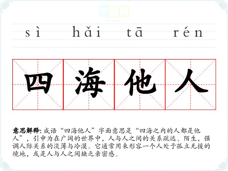 成语“四海他人”字面意思是“四海之内的人都是他人”,引申为在广阔的世界中,人与人之间的关系疏远、陌生,强调人际关系的淡*与冷漠。它通常用来形容一个人处于孤立无援的境地,或是人与人之间缺乏亲密感。